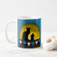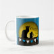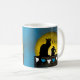 Uma silhueta do gato preto de Théophile Steinlen para o clube Le Chat Noir num cenário moderno para Oktoberfest apresentando uma lua amarela, uma caneca de cerveja de cerveja e bandeiras de decoração em azul e branco bávaro. As palavras "O'zapft é! Halt Deine Lederhosen fest" significa "Está tapado!" Segure-se no seu Lederhosen."