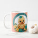 Trabalhando em volta da pista. Feliz frango bebê com flores caneca.