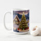 Serene Christmas holiday landscape scene with decorated Christmas tree in the midst of a village in early evening.