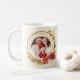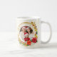 This custom mug is the perfect way to make a memorable gift for family, friends, or even yourself! It features a vibrant, high-quality print of a gorgeous gold glitter-effect wreath encircling your cherished family photo. The wreath is beautifully accented with classic holiday elements like poinsettias, holly, berries, and evergreen sprigs.