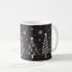 Black Christmas Coffee Mug with white chalkboard style Christmas Trees and Snowflakes doodles. Fantastic monochrome design featuring white christmas trees and snowflakes on black, night sky. Modern, chic design. Ideal for a Christmas gift. Features Digital Art based on Hand Drawn Christmas Trees and Snowflakes Doodles.