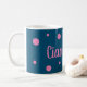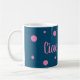 Caneca de Ciao Bella, perfeitamente pré-disquete e chique, em azul escuro, com bolinhas e letras rosa brilhantes
