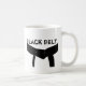A Taça Básica de Café Black Belt de Artes Marciais apresenta um cinturão negro preso em um nó com fundo branco e as palavras BLACK BELT em uma fonte angustiada.