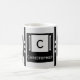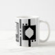 Ideia de presente de caneca de café. Adicione um nome e inicial. Cinza e preto, com formas de diamante, quadrados e listras.