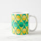 Esta caneca tem um design de deco de arte de círculos amarelos e verdes com dois tons dentro de triângulos amarelos e verdes com dois tons.