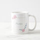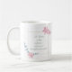 Esta caneca bonita é perfeita para o Dia das Mães ou como presente para a Mãe da Noiva. De um lado está a frase "Uma mãe é como uma flor - cada uma é bela e única" inserida num quadrado, moldura geométrica dourada decorada com flores cor-de-rosa em aquarela e folhagens azul-esverdeadas. O desenho geométrico floral é repetido do outro lado com um campo personalizável para o nome dela. No centro da caneca, entre as duas molduras, há um pequeno elemento de folhagem e flor correspondente. O texto está numa fonte elegante de escrita azul-esverdeada.