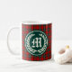Caneca de café com tartã para Clan MacGregor e suas sebes, incluindo Dochart e Peterkin, uma popular xadrez escocesa tradicional em vermelho vivo, com sotaques verdes e brancos escuros. Padrão de safra de 1884. Ambos os lados da caneca apresentam um crachá verde de caçador redondo com louros e seu monograma inicial em um antigo idioma inglês.
