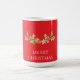 Festive red background with holly leaves, berries, pine cone and ornament, perfect for elegant holiday cards and seasonal decorations