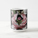 An imaginary gemstone flower composed of a pink diamond bud surrounded by large pink and white petals covers this mug.