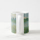 Uma caneca com a proibição de Claude Monet da pintura do Sena. Antiga arte francesa famosa com um rio, árvores e flores verdes de campo no estilo impressionista. Licença CCO, dominio público art.