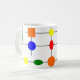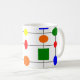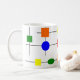Esta caneca tem um design Bauhaus de uma grade com formas em vermelho, amarelo, laranja, verde e azul plotadas nela.