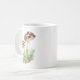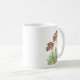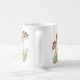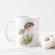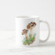 trabalho de arte de aquarela tradicional de dois grandes cogumelos castanhos, que crescem a partir de um chão florestal verde e castanho numa caneca de café.
