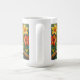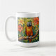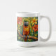 A sweet personalized coffee mug with an impasto painting style parrot and colorful coral and yellow tropical flowers.