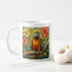 A sweet personalized coffee mug with an impasto painting style parrot and colorful coral and yellow tropical flowers.