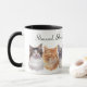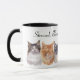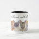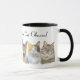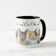 "Estressado, abençoado e obcecado" declara esta caneca em texto preto. Abaixo do texto está um grupo de cinco felinos bonito, imagens aquáticas de diferentes cores e raças. Sabe que conhece alguém que precisa dessa caneca...talvez até você!