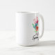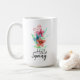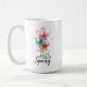 Caneca de café da primavera fofa apresentando flores e folhas de aquarela laranja, rosa e azul. "Olá Primavera" está em dois tipos de tipografia.
