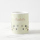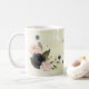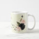 Linda caneca romântica com flores pretas e rosa e algumas folhas bonitas .