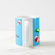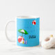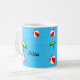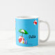 Adicione seu nome em ambos os lados da caneca com arte divertida de tema de praia ou piscina com bola de praia vermelha, guarda-sol verde, sandálias de férias e óleo bronzeador em um fundo azul aquático com ondas onduladas.