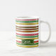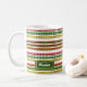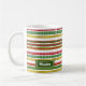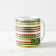 Este design de caneca apresenta um padrão de listras natalinas vermelhas, amarelas e verdes. São cores comumente associadas ao Natal. Também apresenta um nome personalizável e ano em texto branco dentro de uma área de cor escura.