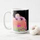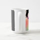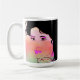 Very colorful drawing of woman's face on mug. Black and pink with green. Contemporary.