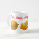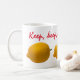Limão amarelo que é comido picada por mordida e um texto vermelho Mantenha Sorriso! Nunca desista e mantenha o queixo acordado! Se viver te dá um limão, faça limonada! Uma caneca de café engraçada. Você pode alterar ou excluir as imagens e o texto do modelo: Mantenha, mantenha, continue sorrindo!