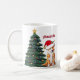 Este lindo cão Pembroke Welsh Corgi tem a cabeça inclinada dentro de um bonitinho chapéu de Papai Noel. O filhote está sentado em frente a uma bonito árvore de Natal decorada com ornamentos coloridos. Personalize o nome do seu animal de estimação em encantador cursivo sob o maravilhoso desenho do meu cachorro favorito numa caneca festiva de férias.