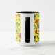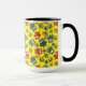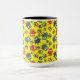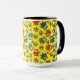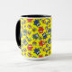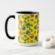 Uma Caneca Ringer branca com uma borda e alça pretas e um padrão de corujas fofas em vermelho, azul e verde sobre um fundo amarelo, que você pode facilmente alterar usando o botão de edição. O padrão de coruja foi um design original de colagem de papel pintado à mão por Judy Adamson.