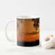 Uma caneca engraçada de um vaqueiro a ropar no cavalo perseguindo um boi no pôr do sol.