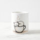Um gatinho branco liso dorme pacificamente enrolando dentro uma caneca de café quente, com ascensão de vapor suavemente à sua volta, evocando um senso de conforto e calor.