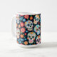 Crânios de açúcar pintados caem através de flores coloridas nesta caneca de café para Dia de Los Muertos.