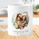 Create your own custom photo coffee mug. This cup features two of your favorite pictures in a circle shaped watercolor brush stroke frame and personalized text for any occasion. A great gift for family and friends or your own photo memory keepsake.
