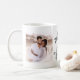Esta caneca de na moda, preta e branca apresenta uma ilustração desenhada à mão de uma crista com pombas e flores. O texto é uma mistura de textos manuscritos de tendências e textos clássicos para um olhar caprichoso e romântico. Adicione duas das suas fotos favoritas de casamento e seu monograma e data de casamento.