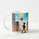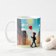 Uma cena alegre de uma criança caminhando pela rua, segurando um balão vermelho brilhante, simbolizando a liberdade, a felicidade e as simples alegrias da infância.