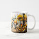 Mug apresentando crianças voltando à escola em uma paisagem de outono com flores e borboletas. Uma caneca bonita, boa para crianças e adultos.