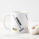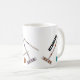 Esta caneca de café personalizada apresenta ilustrações de diferentes equipamentos de um conjunto de croquetes com maletas, bolas e placas gráficas de wickets. As ilustrações envolvem a caneca. O nome aparece em ambos os lados da caneca.