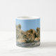 Caneca de café cerâmica mostrada com um impressão de foto de filhotes de leões fofos. Personalize este item ou comprar como está. Imagem do stock