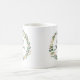 Esta simples e na moda, caneca, apresenta uma fabulosa camada aquática com folhas verdes e falsas de ouro e groselhas vermelhas, e uma tipografia moderna preta que diz "Feliz Natal" num fundo branco.