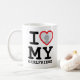 Create your own black and red I Love My Girlfriend custom Photo and Text mug with this modern and funny shirt template featuring a cool slab serif font and girlfriend photo into a huge red heart. Add your own photo, your name or any personalized text. The "I love My Girlfriend" mugs design is inspired by the classical "I love NY" logo t-shirt graphic design made by Milton Glaser, and I used Courier New Slab font instead of the original rounded slab serif typeface American Typewriter used by Glazer. Make your own unique gift for your boyfriend with this I love my girlfriend mugs!