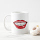 Bright red lips and mouth face print with white teeth mugs. Tags: "bright red lips print", "fierce mouth with white teeth", "whimsical funny face and mouth", "cute cheerful comic fake smile", "scary crazy fun pattern gifts", "silly couples novelty valentines style", "playful custom text personalized", "cartoon lip for her him", "gift idea for husband wife", "boyfriend girlfriend kiss love loving",