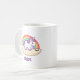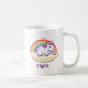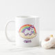 Um unicórnio bebê roxo super fofo andando numa banana feliz sob um arco-íris brilhante. Personalize com seu próprio texto.