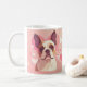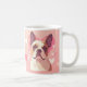 This adorable French Bulldog mug features a soft pink background with sweet heart details and a gentle, loving expression.