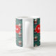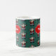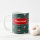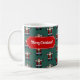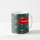 Santa Claus on a Christmas mug. Use "Personalize this template" to change the "Merry Christmas!" text and create a unique, customized gift; text changes are reflected on both sides. Enjoy a warming hot chocolate at Christmas in this mug, featuring a busy repeat of Father Christmas doing a star jump. Drawn in a retro, pixel art style, a traditional Santa Claus decked in red suit and hat with white fur trim, black boots and belt with a gold buckle, brown mittens and a fluffy white beard.