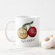A cute sheep on a Christmas mug. Use "Personalize this template" to change the "BAA HUMBUG!" text and create a unique, customized gift; text changes are reflected on both sides. Featuring a cartoon of two Xmas decorations on a Christmas tree branch; one gold and shiny with a baaing sheep, the other red and sparkling with a humbug sweet, to make the phrase "baa humbug" (a play on bah humbug!) in pictures.
