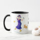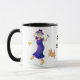 Uma caneca de café branco com uma borda preta e punho, decorado com uma dança idosa da mulher e o canto, de uma pintura do watercolour por Judy Adamson. A mulher é vestida em cores brilhantes, com as botas floridos amarelas e um chapéu roxo. Está guardarando um microfone e seu cão pequeno está juntando-se na dança. O texto, no preto, que você pode personalizar, é "avó Groovy". Os cartões, os marcador e as imãs de geladeira com o mesmo design estão igualmente disponíveis.