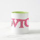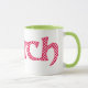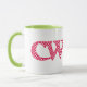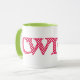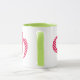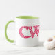 Uma caneca da campainha do divertimento com um bordo e um punho verdes e a palavra "cwtch" de Galês, significando o "afago" ou o "abraço", em um roteiro celta, encheram-se com um teste padrão de bolinhas vermelho e branco brilhante.