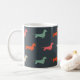 Dachshund Silhouettes Mug. Esta caneca legal faz um presente de excelente para amantes de cachorros. Padrão colorido de silhuetas com cães com pelo longo, com fio e com revestimento liso. Visite o Doodle World de Jenn para obter ainda mais produtos com este design de Doxies divertidos, assim como mais presentes temáticos de raças de cães.