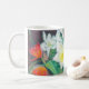 Uma caneca branca decorada com tulipas vermelhas e daffodils de uma pintura original de Pastel de Óleo de Judy Adamson.