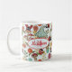 Nome personalizável e caneca monográfica com leveza, plantas, flores e cogumelos vermelhos pintados e bonitos, com efeito brilhante.