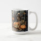 Jack-o-lanternas olha como três esqueletos dançando em frente a uma casa assombrada nesta linda e divertida caneca de café do Halloween.