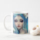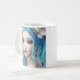 Bonito garota de arte de conto de fadas etéreo com flores em seu cabelo azul e citando atrás da caneca de café. Conteúdo genérico da arte Ai